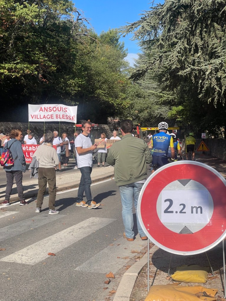 Långdansen kring bron är komplicerad. Bron skadades ursprungligen i augusti 2020 av att en lastbil fastnade, några stenar ramlade ner och det uppdagades att konstruktionen löpte risk att vittra sönder yttergare. Bron är gammal, ett nationellt minnesmärke och den tillhör Chateau d’Ansouis. Under bron löper en väg som sammanbinder Sud-Luberon med närmaste större ort, Pertuis. Och den vägen är regional, dvs det är det större området, departementet som ansvarar för själva vägen. För att göra soppan ännu mustigare så är ju kommunen Ansouis givetvis också inblandad. Med borgmästaren i spetsen, som dessutom är slottets förra ägare. En extra krydda i soppan. De inblandade är alltså slottsägarna, kommunen och borgmästaren, departementet och regionen. Samt de myndigheter som ansvarar för byggnadsminnesmärken. Alla är i luven på alla, ingen vill ta ansvar för reparationen av bron, försäkringsbolagen grälar, jurister är inblandade och det enda som har hänt är att bron några månader efter att den gått sönder fick en tillfällig stödkonstruktion som tillåter personbilar att köra under den. Men när den tillfälliga konstruktionen skadades av en campingbil i augusti i år och bron stängdes på nytt fick kommuninvånarna slutgiltigt nog. Det blev namninsamlingar, artiklar i La Provence och till sist söndagens demonstration.