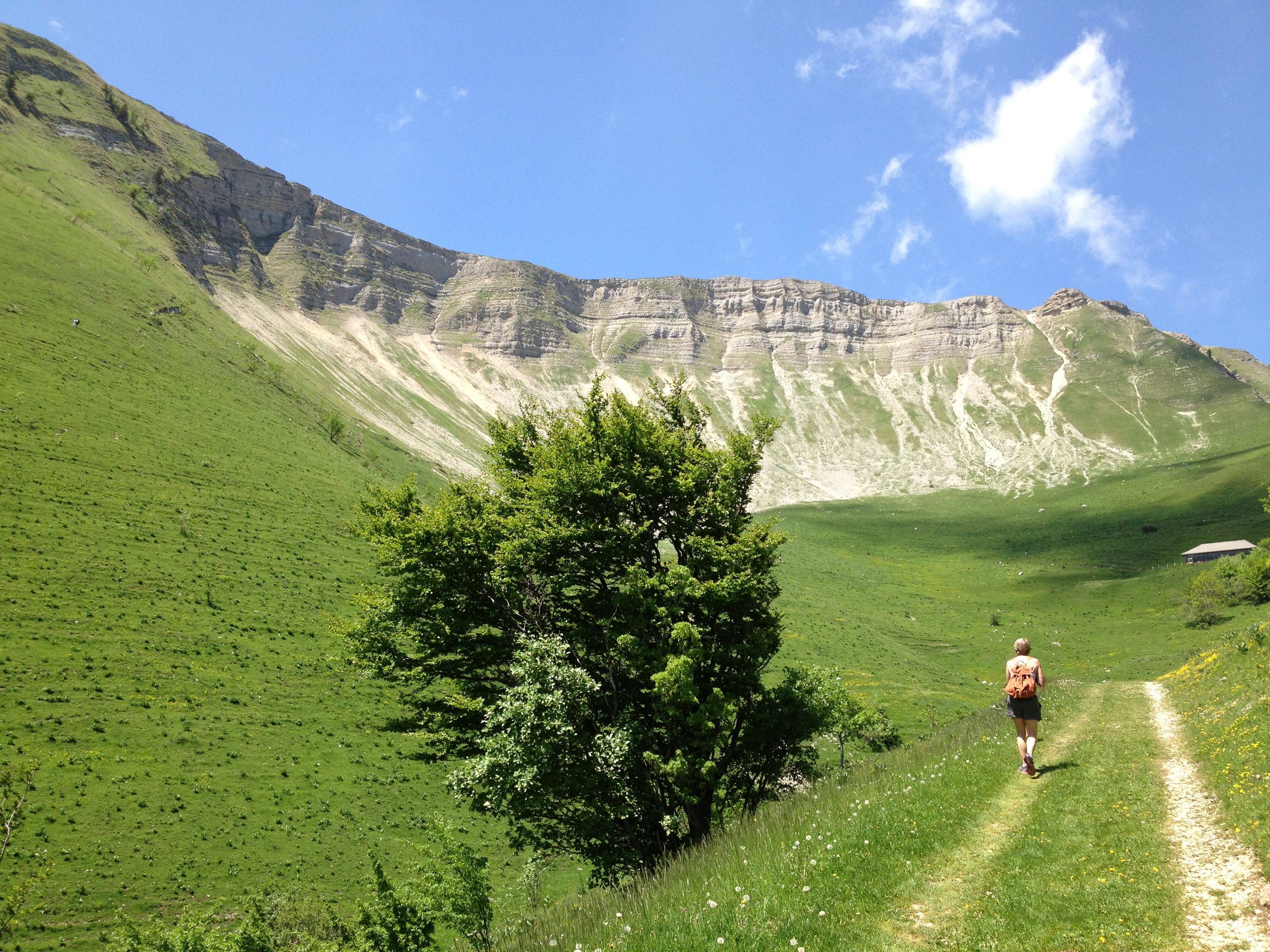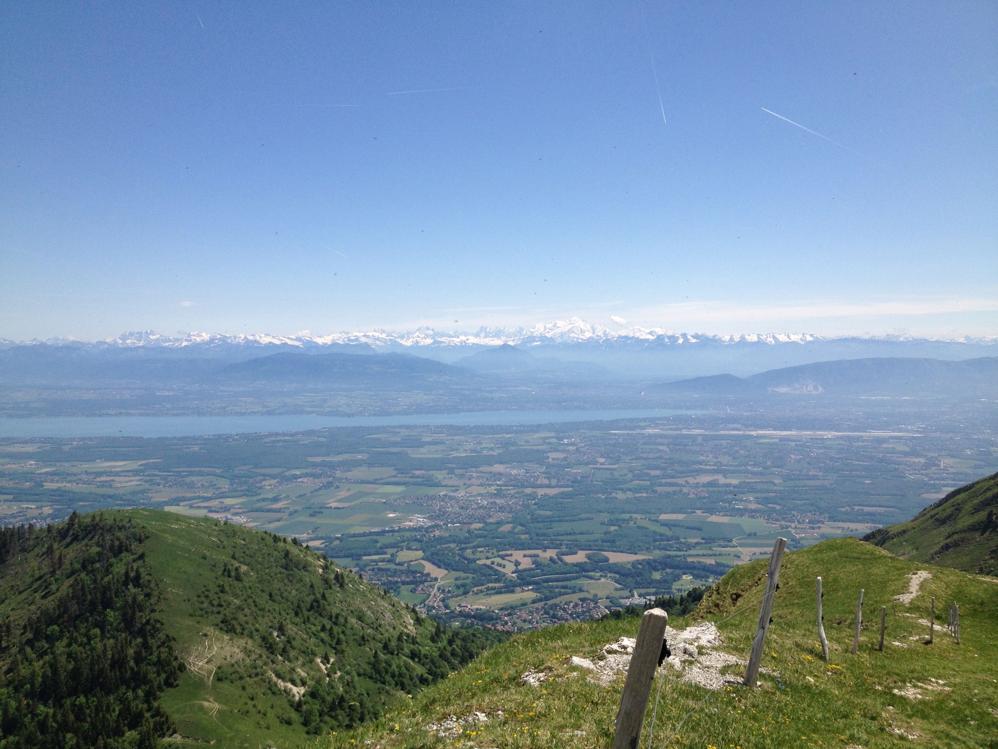 Jurabergen är nu så gott som snölösa, några vita fläckar ligger kvar högst upp, vilket vi lärde oss när vi vandrade upp till den högsta toppen i närheten, Colomby de Gex (1688 m). I jämförelse med alperna – isynnerhet Mont Blanc – vid horisonten är jurabergena förstås bara små kullar, men utsikten över Geneve-sjön är fantastisk och ängarna högst uppe väldigt vackra.