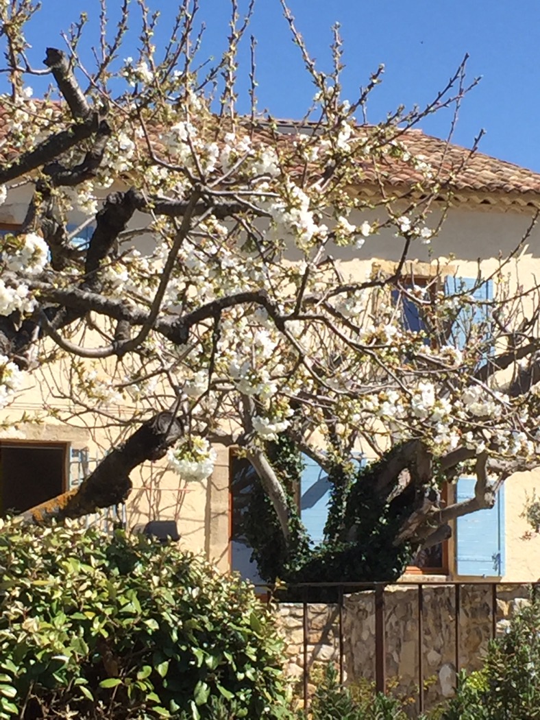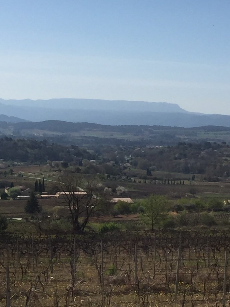 Huset ligger uppe på en backe i ena ändan på en smal ås. Så vi har utsikt åt två håll. Norrut mot Luberon, söderut mot Sainte Victoire. Inte alls illa. Åsen är till största delen obebyggd och skogsklädd, så Africa och jag har bra promenadstigar till vårt förfogande. Tillsammans med vildsvinen och hararna och ekorrarna och vad det nu kan finnas för andra djur. Resten av markerna här runtomkring är mest åkrar och vinodlingar.