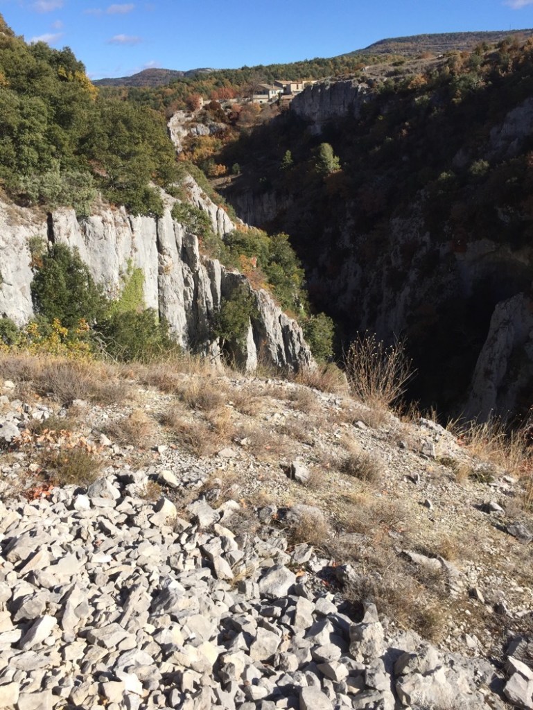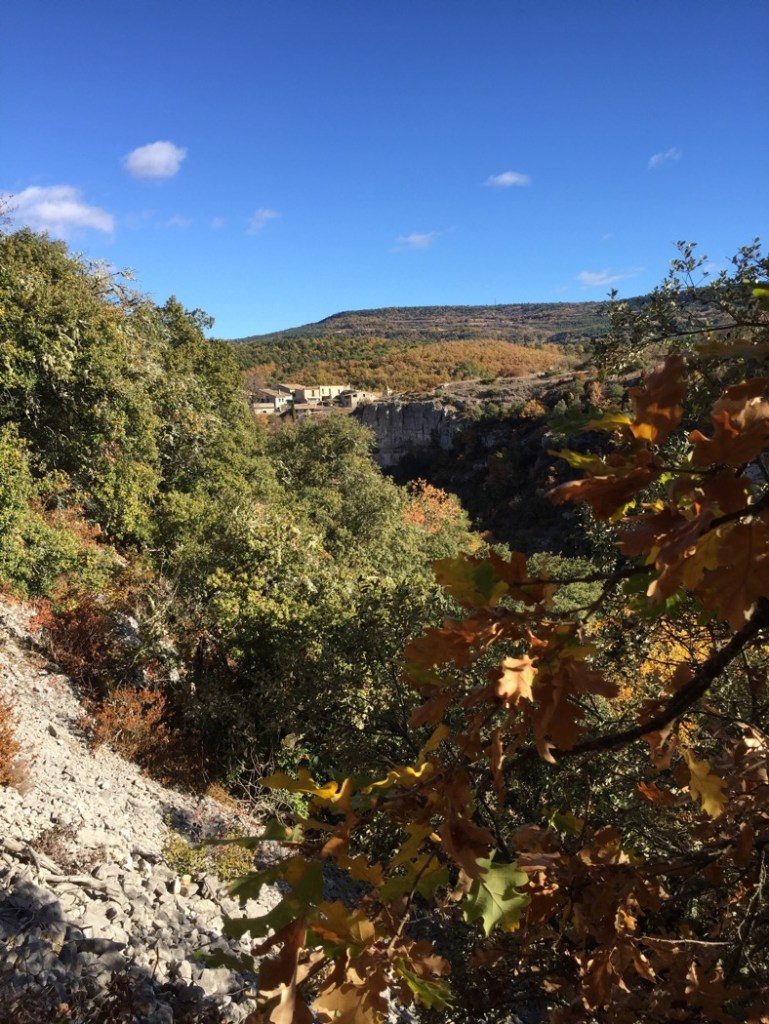 The walk this Sunday was to Gorge d’Oppedette, on the northeastern side of Luberon. We had to drive for almost an hour to get there, but it was surely worth it. Both because of the exciting walk that followed, and because the drive was nice. The colours on the northern slopes of the Luberon are stunning right now, and the road was one of these typically small, winding French roads that run through old villages and beautiful landscape, often too narrow for two cars to pass. Which makes driving challenging and slow.
